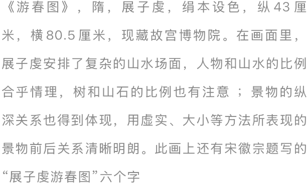 早期的中国山水画存世未几,现藏故宫博物院的《展子虔游春图》可说弥足珍稀。《展子虔游春图》的出现,是中国山水画解脱东说念主物画从属地位而成为寂然存在的径直凭证,它在中国画图史上的价值显而易见。值得一提的是,《展子虔游春图》整幅画广博使用石青、石绿着色。所谓“青绿重彩工清雅整”,被后东说念主称为青绿法。到盛唐工夫,东说念主称“大小李将军”的李念念训、李昭说念父子则将“青绿”山水画推向新的岑岭。