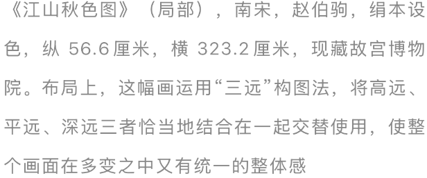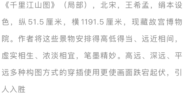 著名的《沉江山图》就是在这么的“崇古”潮水中出现的。提及来,青绿山水的画风,入宋以后便不复往昔之盛,《宣和画谱》中论及董源画风时就提到“其时(指五代末、北宋初)着色山水未多,能效(李)念念训者亦少”。因此,故宫博物院藏王希孟所作《沉江山图》,就成为现有北宋青绿山水画中最为出色的作品。