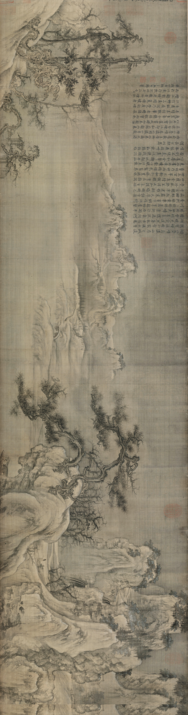“元季四家”中以黄公望的配置为最高。黄公望其东说念主久居江南,他的山水画素材,就来自这些山林胜处。他很嗜好形象的笔录,在《山水诀》中,黄公望提到“皮袋中,置描笔在内,或于好景处,见树有歪邪,便当摹写记之”,远程繁重,可见一斑。带有传奇颜色的《富春山居图》(今分藏浙江省博物馆与台北故宫博物院)等于黄公望如斯“计较七年而成”的佳构。而故宫博物院藏《九峰雪霁图》则是黄公望的另一佳作。这幅作品,翰墨未几,以洗练的手法,充分地发扬雪山的洁净而又杂沓的描写。图中的中、近景以干笔勾廓叠石,坡边微染赭黄,辽阔九峰留白,以淡墨衬染出雪山。他画山上小树,所用之笔,作“竹根、花须”闭幕,奥秘地发扬出层叠雪山上的凄迷寒林。