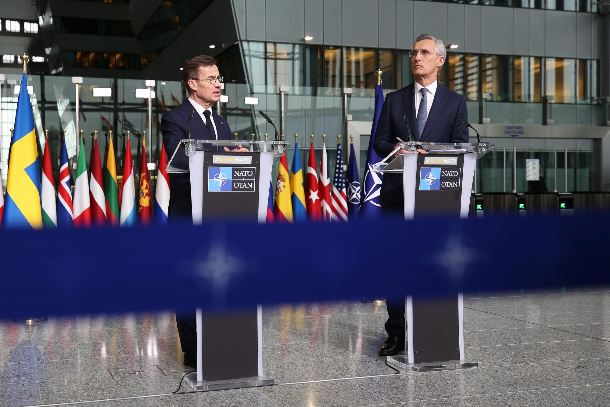 3月11日,在位于比利时布鲁塞尔的北约总部,瑞典首相克里斯特松(左)和北约通知长斯托尔滕贝格出席聚集新闻发布会。新华社记者赵丁喆摄